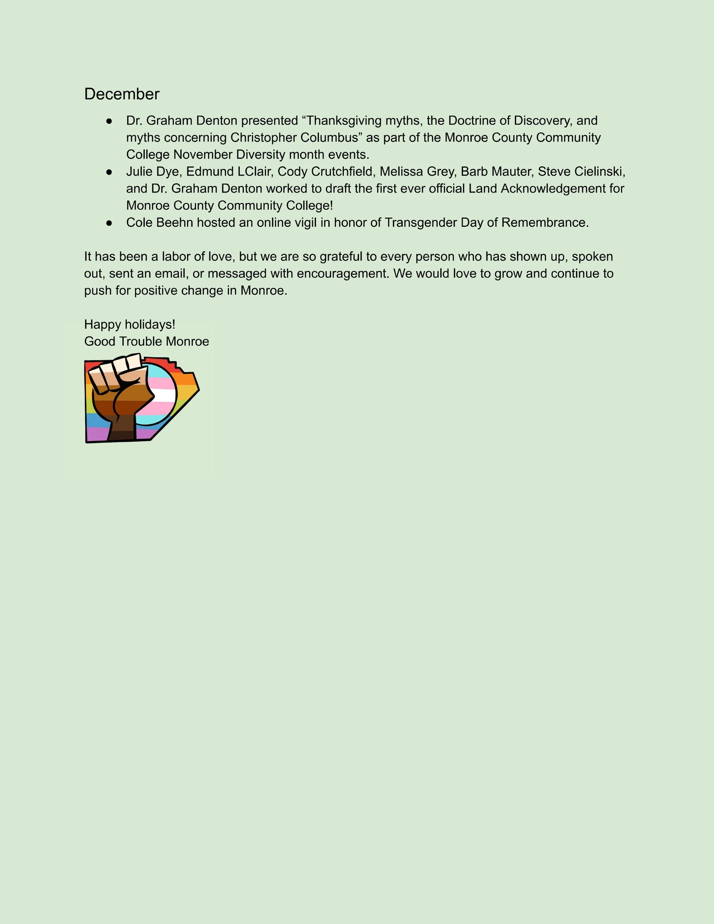 Thank you for all your support this year; it sure has been a rough one! Starting with an attempted insurrection and ending yet again with covid, Good Trouble Monroe would like you all to focus on the positive things we have accomplished in 2021!